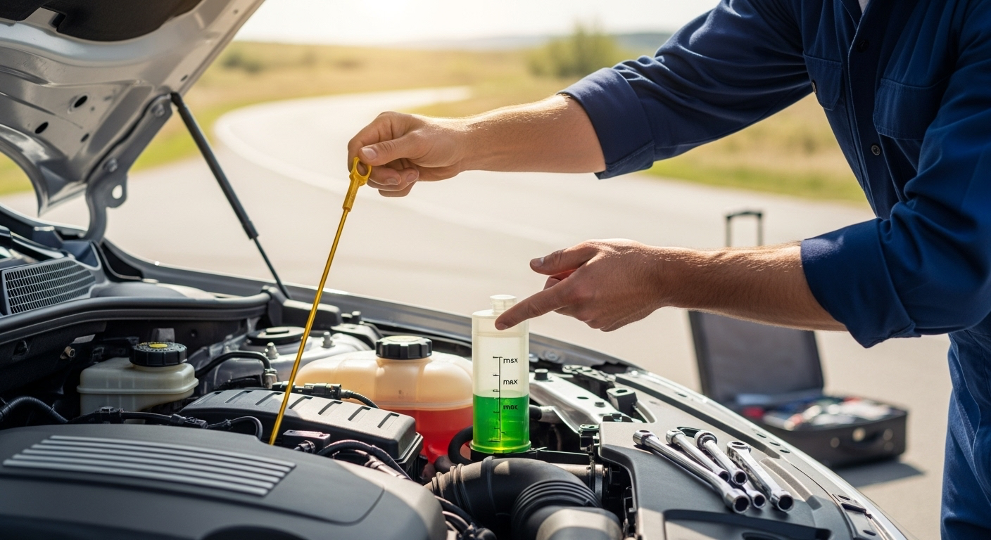 Confirma aceite de motor, refrigerante, líquido de frenos y limpiaparabrisas. Si notas pérdidas o niveles muy bajos, inspecciona posibles fugas o agenda mantenimiento.