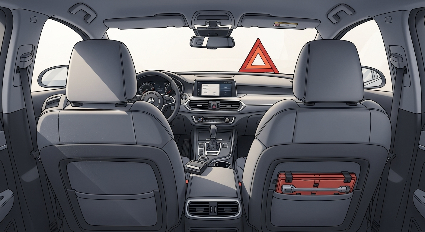 - Verifica que traigas triángulos reflejantes, gato, llave de cruz y, de ser posible, un extintor vigente.