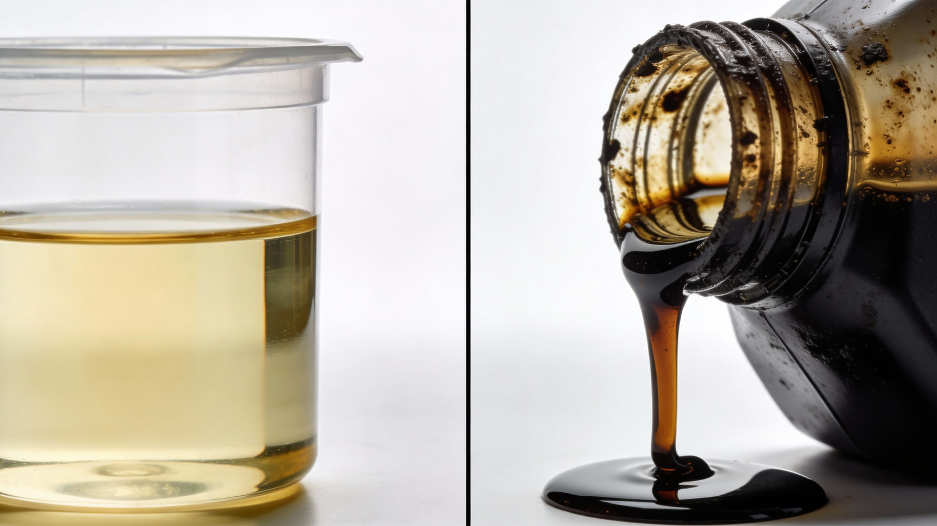 2. A split-screen comparison showing a clean, light-colored synthetic motor oil on one side and a dark, dirty used motor oil on the other side in clear containers, emphasizing the difference between old and new oil quality.