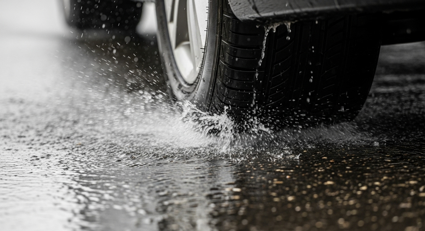 - Dentro #1: “Horizontal, close-up of car tire channeling water on wet asphalt, sharp detail of tread grooves, dynamic splash, high realism.”