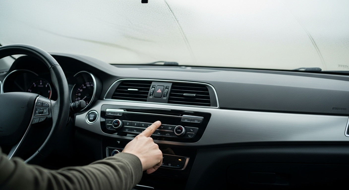 - Dentro #2: “Horizontal, driver hand activating defogger and AC on dashboard, windshield partially fogged then clear area visible, natural cabin lighting.”