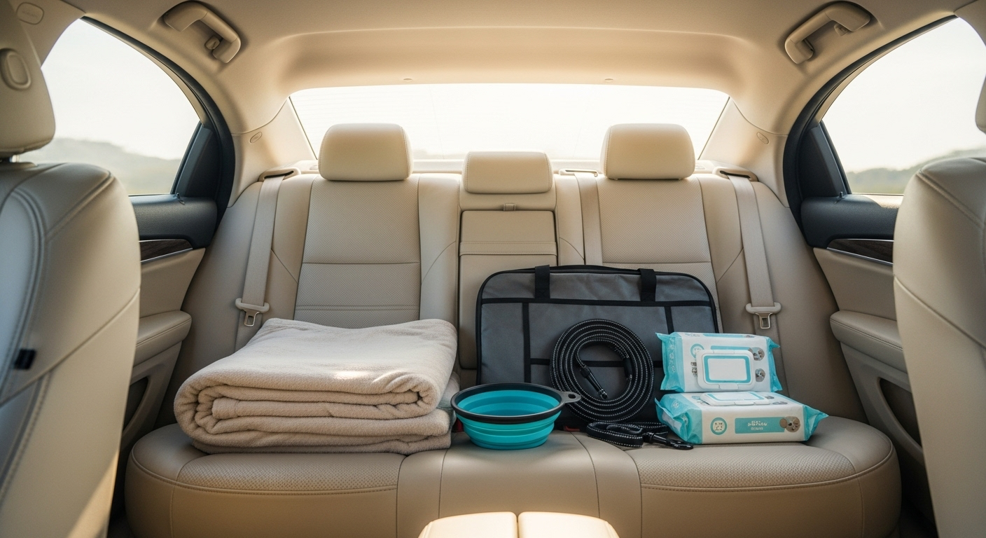 Agua, plato plegable, correa, bolsas, toallitas y una cobija o cama pequeña. - Protecciones en el auto